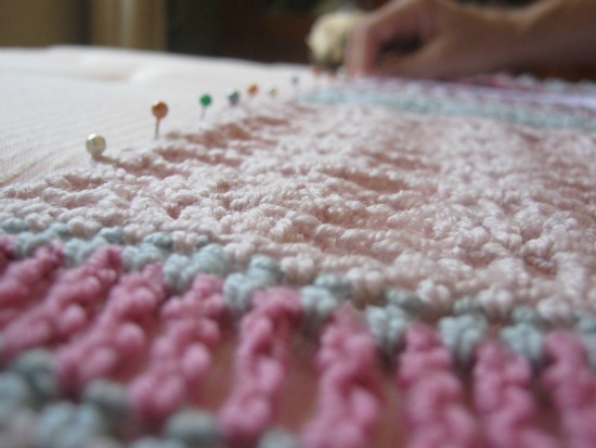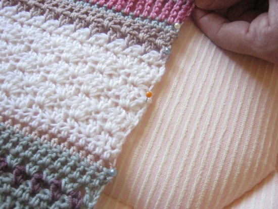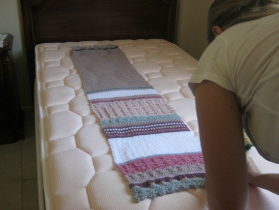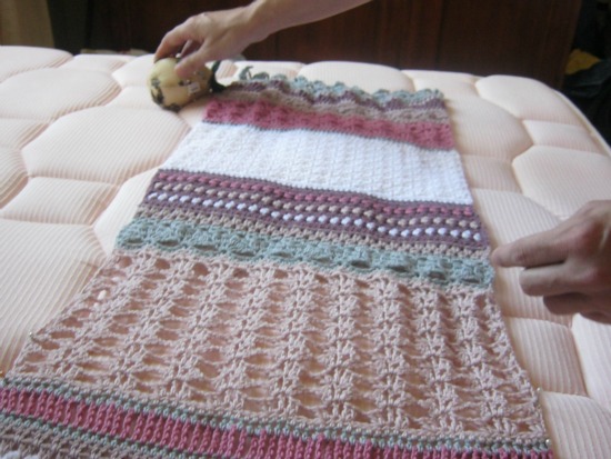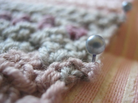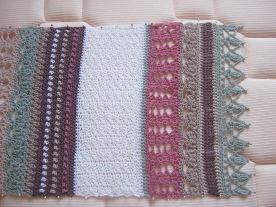 A continuación os hablaré un poco del proceso de bloqueo del chal. Mirad, para este chal que ha resultado algo largo, he utilizado un colchón tapizado en una tela de rayitas que me ha resultado de lo más útil para darle la forma recta a los bordes.