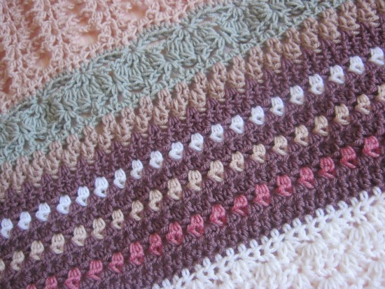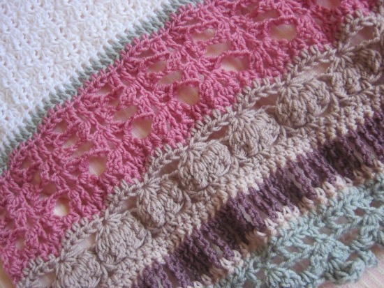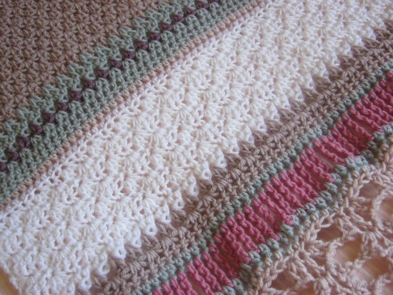 Casi por casualidad, en una tienda de lanas que visité por primera vez, encontré esta gama de tonos rosados, que combiné con gris y blanco, de la marca Valeria di Roma. ¿A que son preciosos? La composición es lana 100%, y a pesar de que el punto es bastante calado y la lana no es demasiado gruesa, tengo que confesar que cuando la llevas, da un calorcito muy agradable.