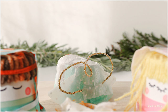Para tapar el pelo y el cuerpo por detrás utilicé papel de seda (San José y ángel) y una servilleta de Tiger (Virgen), sujeto con un lazo.