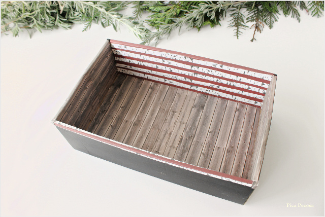 # Paso 1: Forra el interior de la caja con los papeles que imitan texturas. Mi idea inicial era hacer bolas con papel de estraza y pegarlas en el fondo y los laterales para imitar piedras, pero luego me acordé que tenía un papel de Lidl imitando tablas de madera y otro de Tiger que también me encajaba.