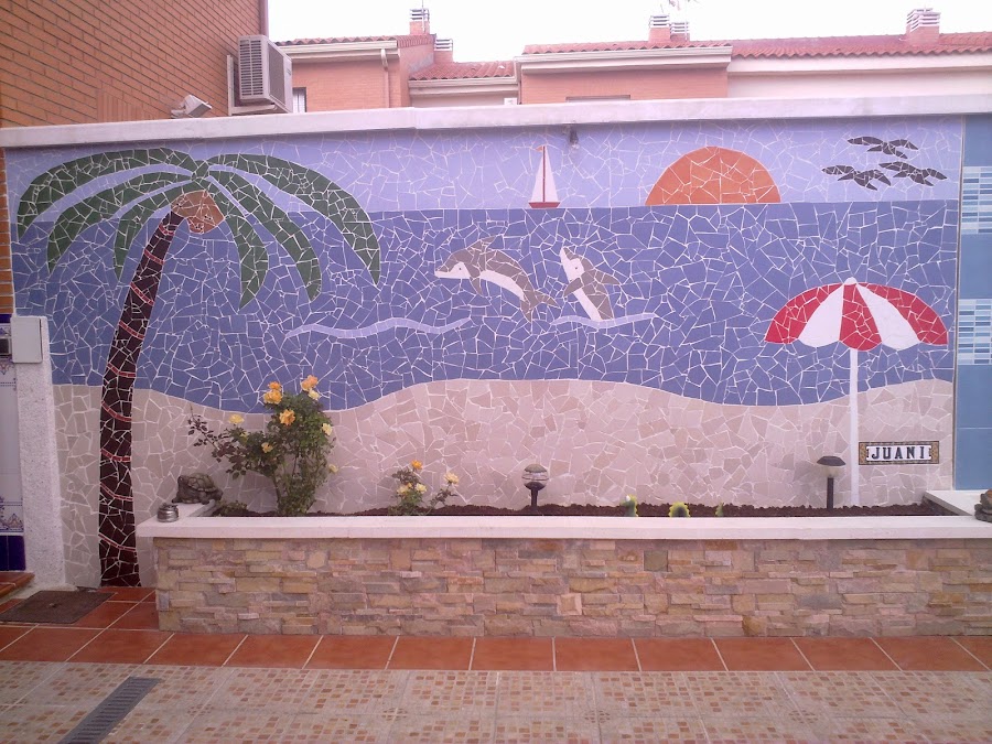 MI MOSAICO? hecho de azulejos rotos .Mide 4,50 metros de ancho por 2,50 metros de alto un trabajo para tener mucha paciencia y tiempo.Os voy a poner otra foto para que veáis como lo empecé . lo primero que se hace es el dibujo y después ir rellenando de azulejo lo que es el dibujo digamos que es como un puzzle ya os digo que mucho trabajo.