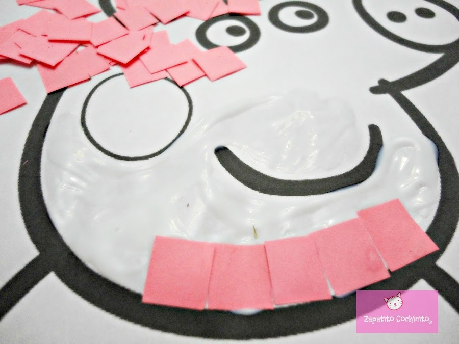 cortar cuadros del mismo tamaño o de varios tamaños , ir pegando para dar una forma en especial o rellenar una imagen , en este caso he usado a la famosa cerdita Peppa pig , que tanto gusta a los niños .