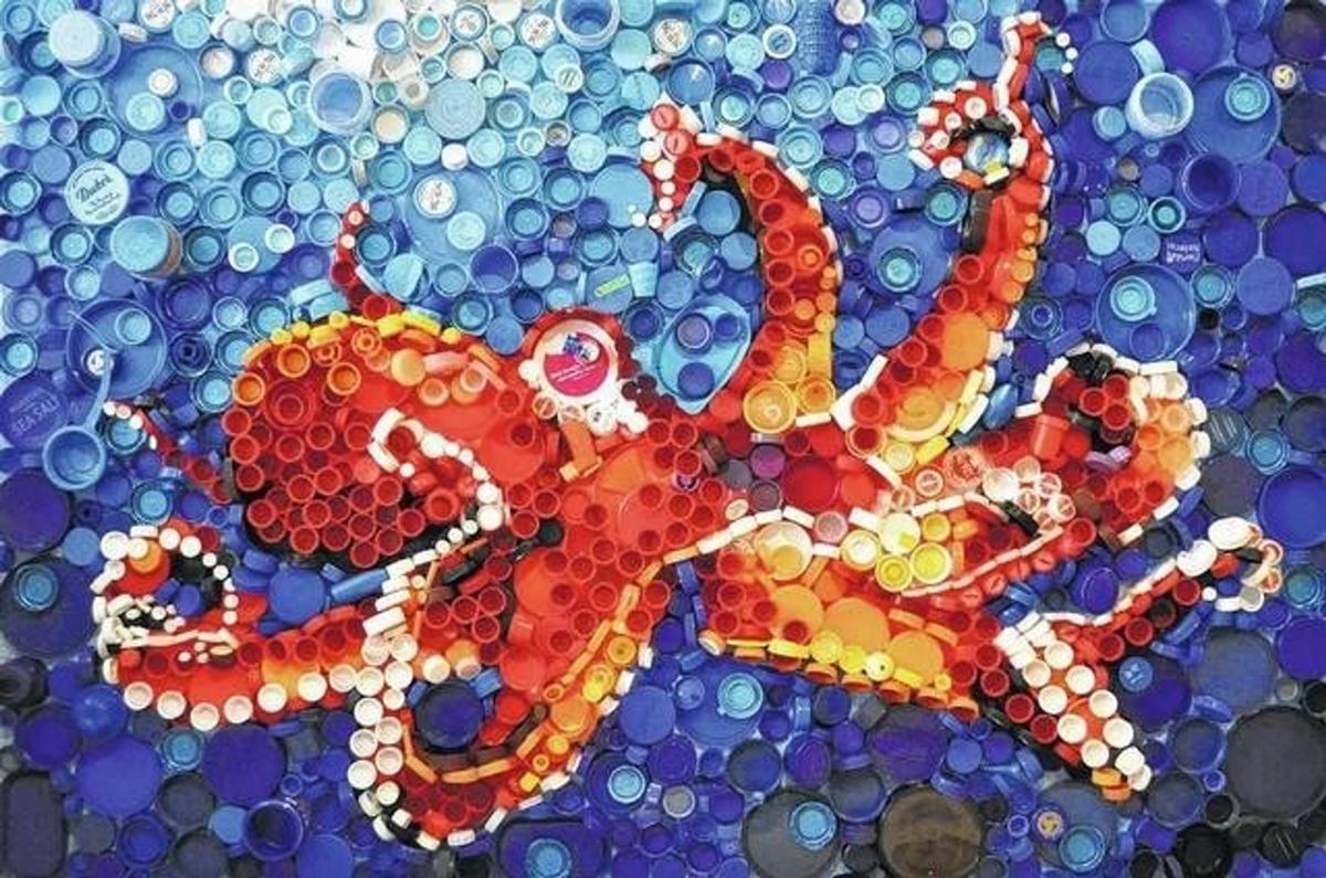 Mosaico con tapones de plástico #recicladocreativo #reciclaje #reciclado #tapones #tapas #plástico #marino #pulpo #mosaico