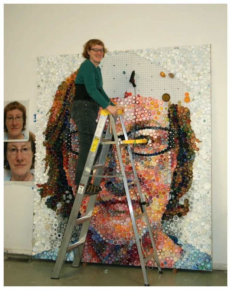No puedo acabar de escribir este post sin compartir, al menos, un par de artistas que han realizado sus obras con tapones de botellas de plástico. Por un lado, Mary Ellen Croteau. Impresiona por su realismo, y cómo consigue hacer degradados utilizando tapones sobre tapones.