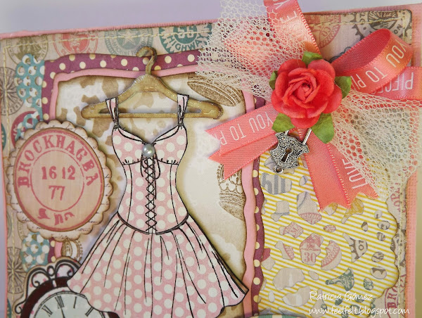 El vestido está en unas etiquetas que son Spellbinders Curved Rectangles. A su izquierda, usé la troqueladora EK Punch Edger Abstract Flower.