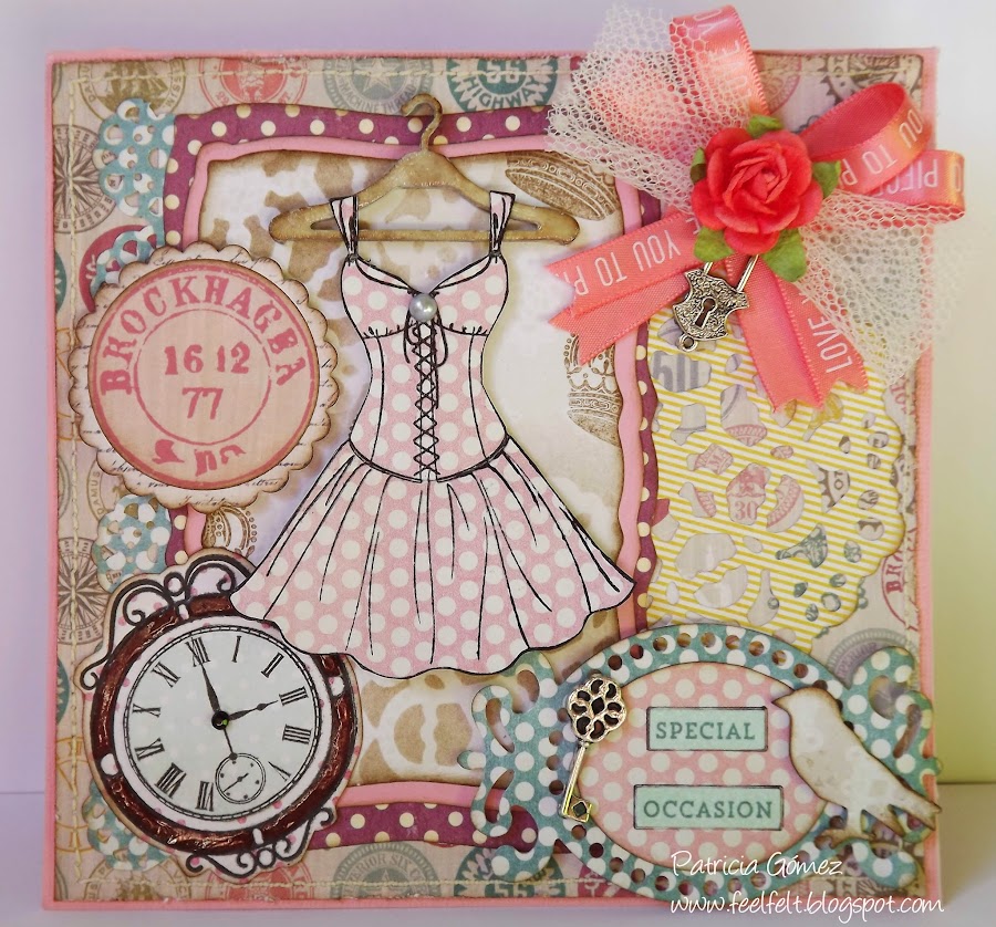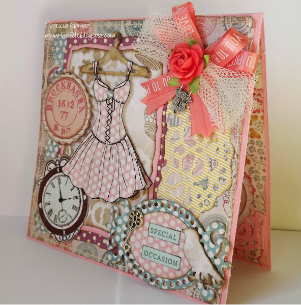 Abajo a la derecha, troquel de etiqueta Spellbinders Fancy tags 3, con mensaje de sticker (Special Occasion), charm de llave y pajarillo que acompaña es troquel Sizzix Tim Holtz Mini Bird and Cage.