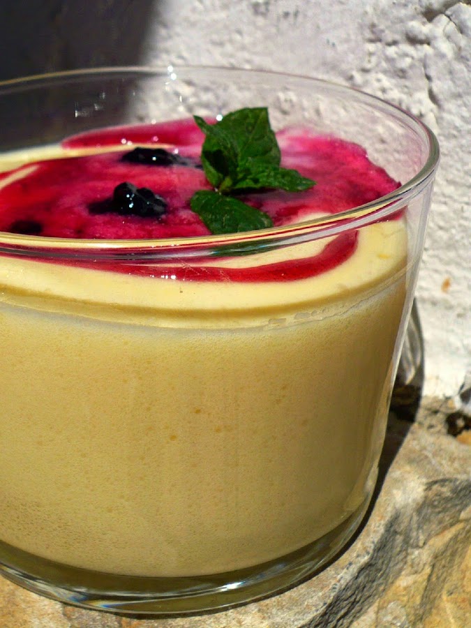 Dejar enfriar en la nevera hasta que queden con una consistencia sólida. Para decorar le he puesto la salsa de moras silvestres que publiqué hace un tiempo. Aunque le da un toque de sabor rico, no lo necesita, y es más que nada para darle color. También podría ir bien para decorarlo unas hojas de menta, por ejemplo.
