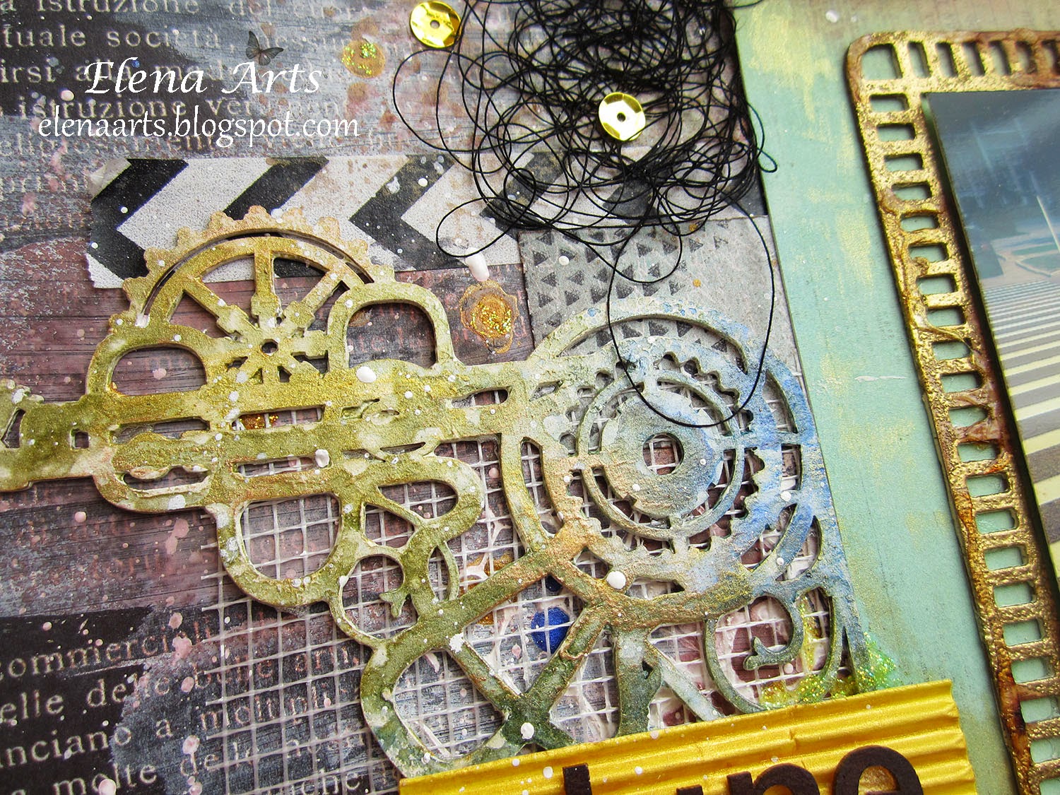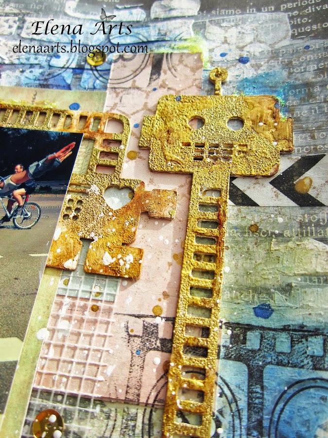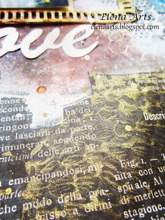 El papel de fondo es de Meliss Frances, modelo "at first blush". Aunque sus productos son más bien del estilo Shabby Chic, este papel es rosa de una cara y por la otra es negro con letras blancas, que contraste, verdad? Las capas de papel, son de 7 Dots Studio, de la colección "Thoughts Keeper", me encantan!!! El chipboard es de Wycinanka, una marca polaca. Además hay mucho gesso, texturas, sellos, embossing, glitter, sprays Color Bloom de Prima Marketing con el efecto brillante... en fin, como debe de ser un trabajo en Mixed Media :))