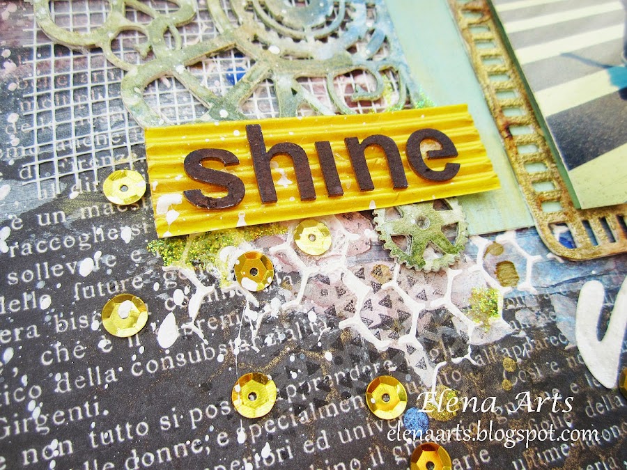 Today I come with a very luminous and positive layout ! In the photo it is my cousin Gala, one of my muses! The base paper is from Meliss Frances, " at first blush ". Though his products are rather of the style Shabby Chic, this paper is a rose of the one side and the black of the other face. That is contrast, isn"t it? The paper layers are from 7 Dots Studio, the collection "Thoughts Keeper", I love them!!! The chipboard is of Wycinanka, a Polish brand. Also, I use a lot of gesso, textures, stamps, embossing, glitter, sprays Color Bloom with the brilliant effect of Prima Marketing ... well, all that must to have a Mixed Media work:))