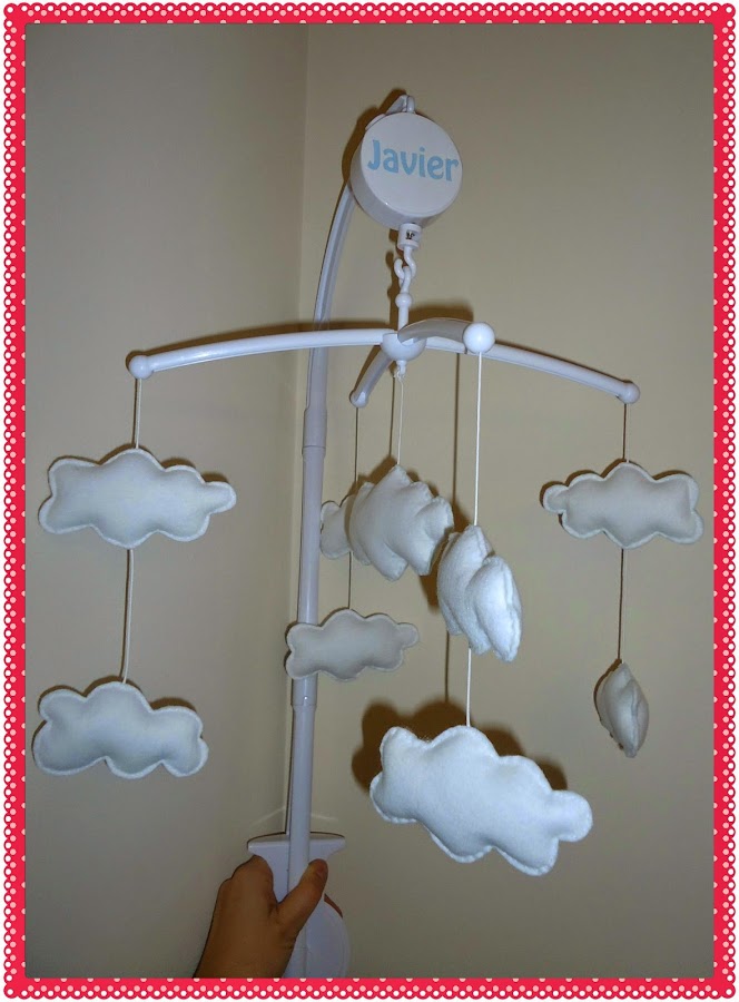Tenía una idea muy clara, de la forma, el tejido, la disposición... y he intentado plasmar su idea, ¡espero haber acertado! Los que me conocéis sabéis que yo prefiero los móviles con más color, para estimular al bebé, pero tengo que admitir que todo blanco queda muy dulce y ayudará a Javier a conciliar el sueño.