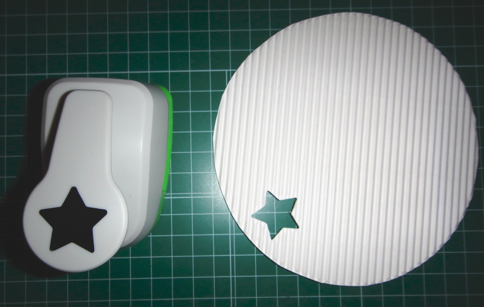 Hice un círculo con cartón ondulado blanco, en el que troquelé una estrella. Esta figura va a ir en el centro de nuestro móvil y representa la luna.