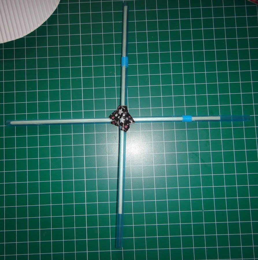 Para montar el móvil yo utilizo pajitas de refresco. En el interior, para que no se doblen, pongo palos de brocheta de madera, cortados para que queden 2 cm más pequeños que la pajita. En el centro los sujeto con washi tape.