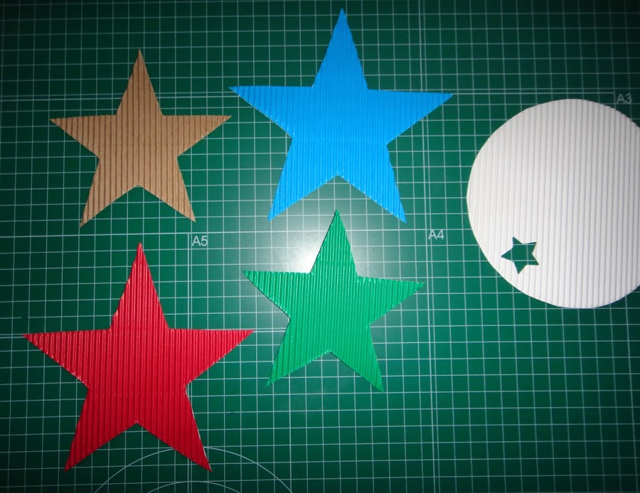 Tenemos que hacer dos estrellas de cada tamaño. Irán las del mismo tamaño en lados opuestos. Pueden ser todas del mismo color, o como he hecho yo, de colores diferentes.