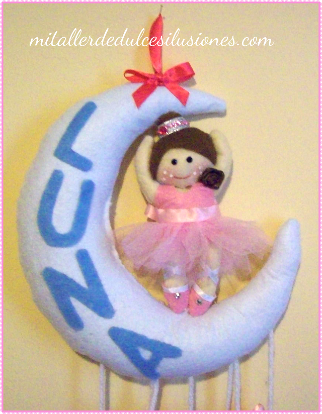La bailarina yo en mi caso la he pegado a la luna con unos puntitos de pegamento caliente ,teniendo mucho cuidado de que no se vean,pero podéis cosela si queréis.
