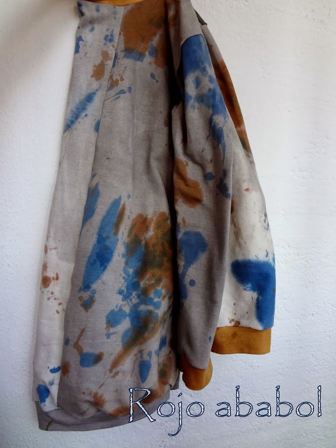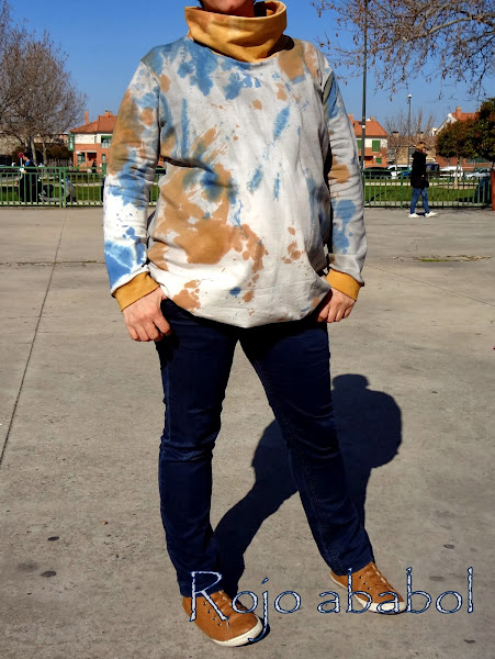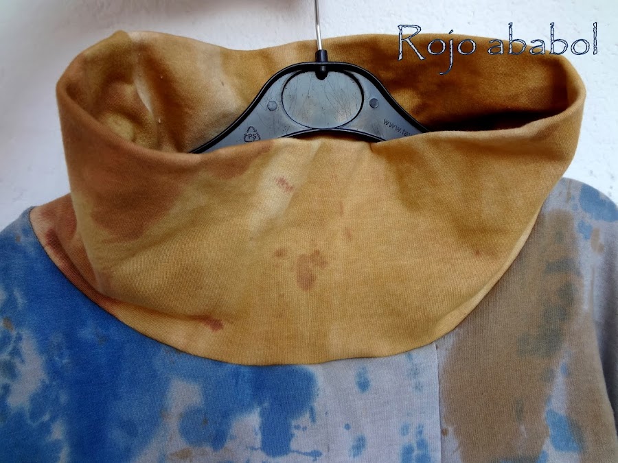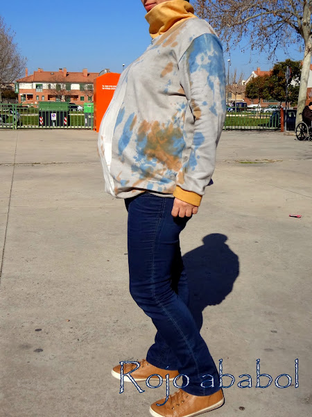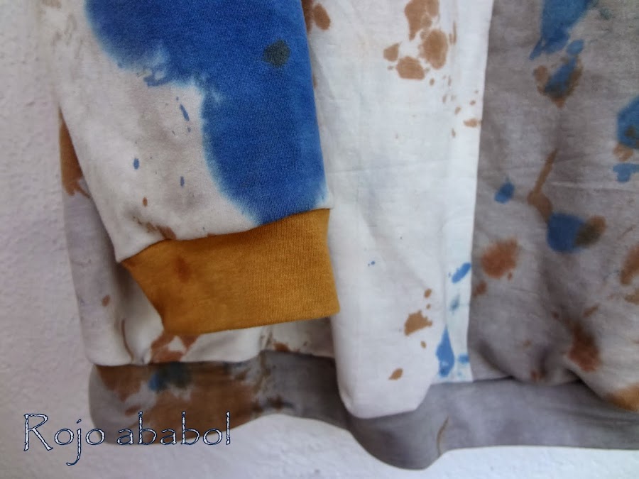 Combiné el mismo tejido pero en distinto color para cuello y puños. En el bajo pequeña cinturilla frunciendo mucho el talle, para no parecer un saco de patatas, de la misma tela que el cuerpo de la sudadera. Ambas telas son las mismas que usé en esta ranita para el gusanito y la mostaza es la misma que la de la solapa de la Siri