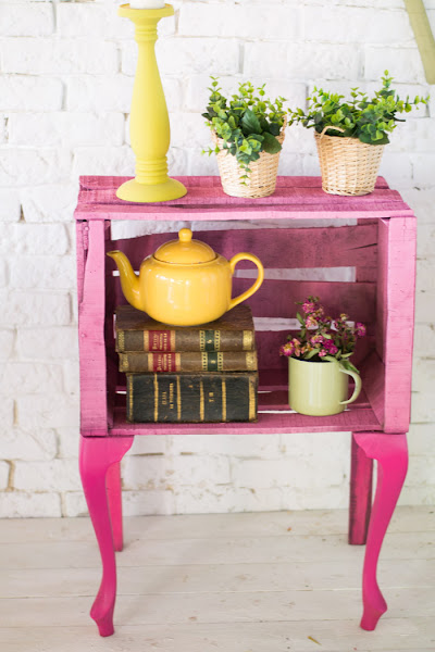 Materiales: Caja de frutas, patas madera o listones, puntas, martillo, cola de carpintero y pintura.