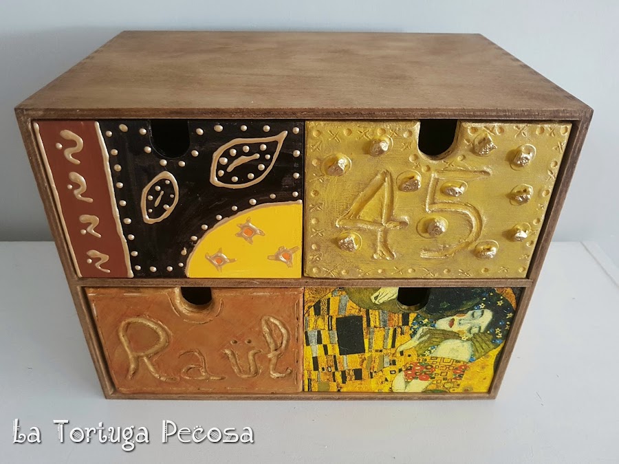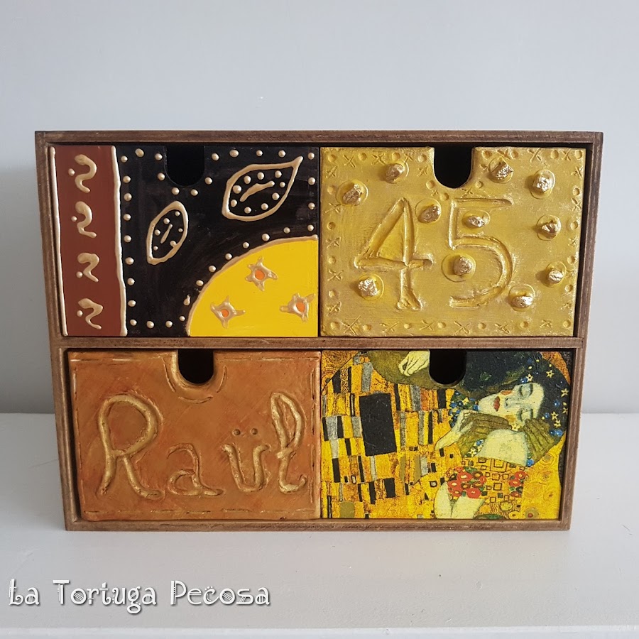 Sobre un mueble color barniz hay cuatro cajones bonitos, cada uno con un motivo especial. El cajón nº 1 va pintado en 3 tonos y rematado con relieve, pues en origen, gustaba el origen oriental. El cajón nº 2 representa un número caracteristico para la destinataria de este joyero. Va en color amarillo y rematado a pincel seco en color dorado. Van pegadas unas pepitas doradas :) a juego. El cajón nº 3 está pintado en color dorado palido y rematado en color marrón tierra a pincel seco. Raül es alguien especial para la destinataria del joyero. El cajón nº 4 está representado por "el beso" de G.Klimt, imagen preciosa que representa a los amantes en El beso solo tienen de base una especie de pradera llena de flores de la madre naturaleza nutriendo aún más el simbolismo del amor.