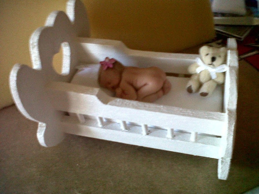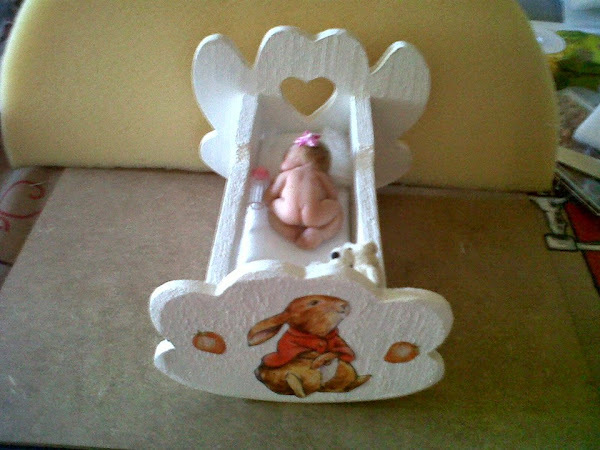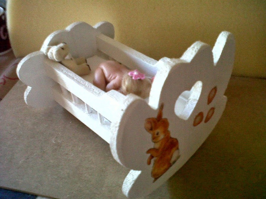 La cunita la compré de madera por internet, la pinté y la decoré con decoupage, y también le hice la ropa de cama. El caballito balancín está hecho de goma eva, con los patrones realizados y cortados ...