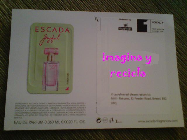 La de Escada me encanta pero es una pena que las muestras sean tan pequeñas tan solo se pueden oler por encima y no las puede oler nadie más casi prefiero ir a las perfumerías y pedir para probar si tienen el probador allí porque son tan minúsculas las que envian que no valen la pena.