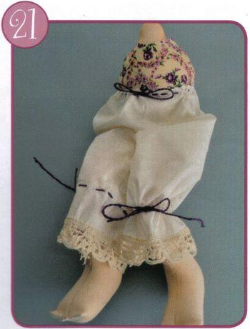 Para los calzones: corta dos veces el molde en tela blanca, enfrenta los derechos, cose primero los tiros, luego enfrentalos y cose la entrepierna. Cose luego, la puntilla en los puños.