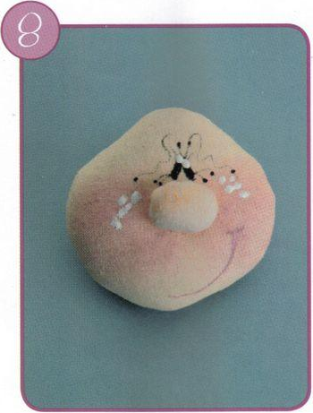 Pega la nariz sobre la puntada. Con la técnica de pincel seco pinta las mejillas de rosa. Liego pinta los ojos y la boca, con el pincel liner.