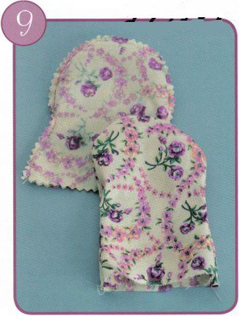 Delantal: Corta un rectángulo de 25 x 10 cm. Realiza un pespunte en el contorno. Luego bastillar la parte inferior. Cose un bolsillo de 12 x 7 cm con puntadas gruesas.