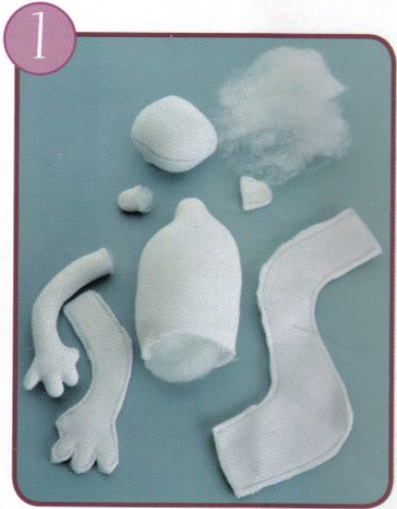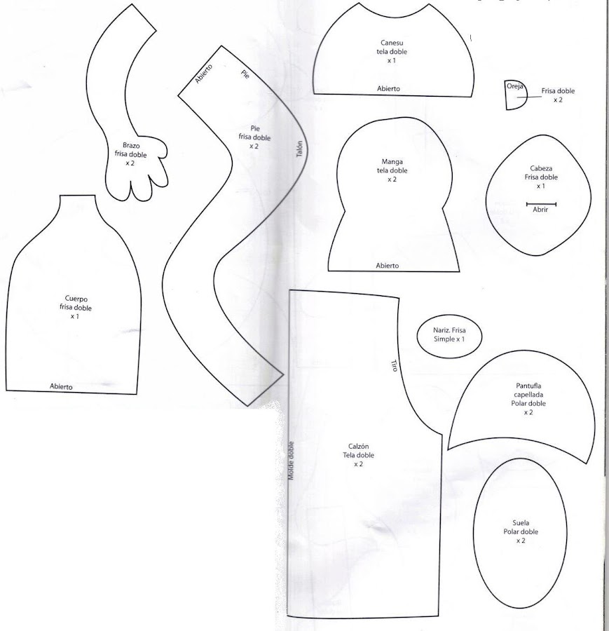 Marca los moldes de cuerpo, cabeza, piernas, brazos y orejas en tela de frisa, enfrentando los derechos. Cose, corta y da la vuelta. Rellena con vellón.