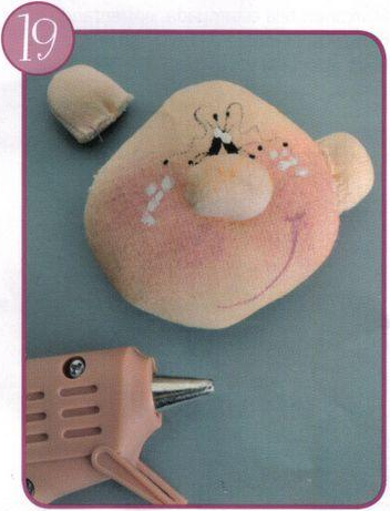 Pega la nariz sobre la puntada. Con la técnica de pincel seco pinta las mejillas de rosa. Liego pinta los ojos y la boca, con el pincel liner.