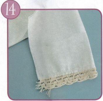 Para los calzones: corta dos veces el molde en tela blanca, enfrenta los derechos, cose primero los tiros, luego enfrentalos y cose la entrepierna. Cose luego, la puntilla en los puños.
