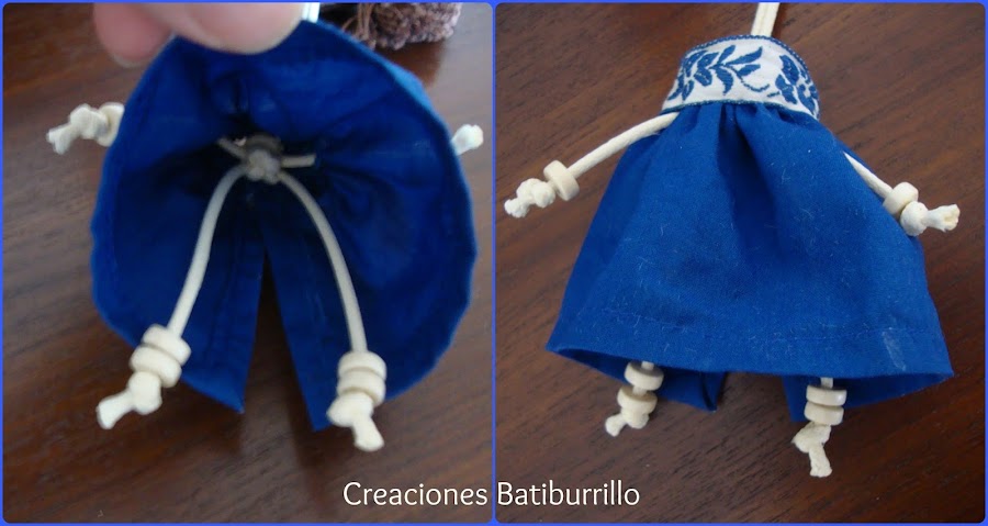 En las puntas unos abalorios y nudo final a modo de manos y pies.