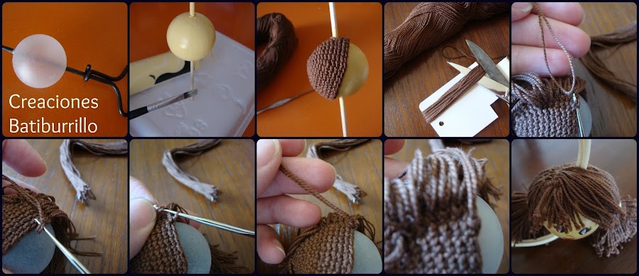 El pelo se puede hacer más sencillo, simplemente cortando trozos de hilo, fijándolos en el medio y pegándolos a la esfera pero quise darle más consistencia y naturalidad, así que tocó trabajo laborioso.