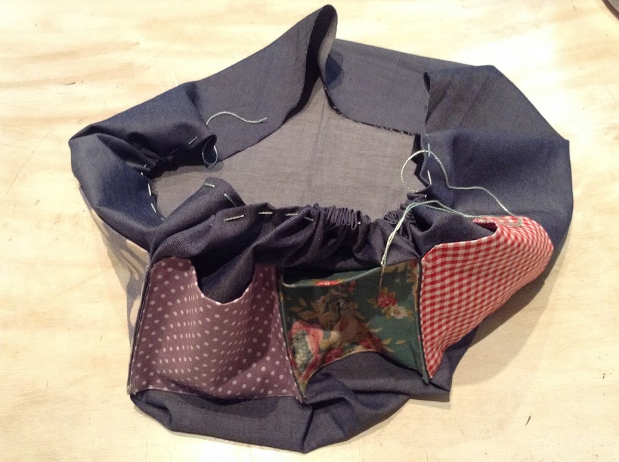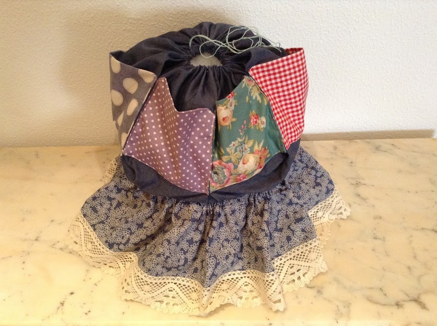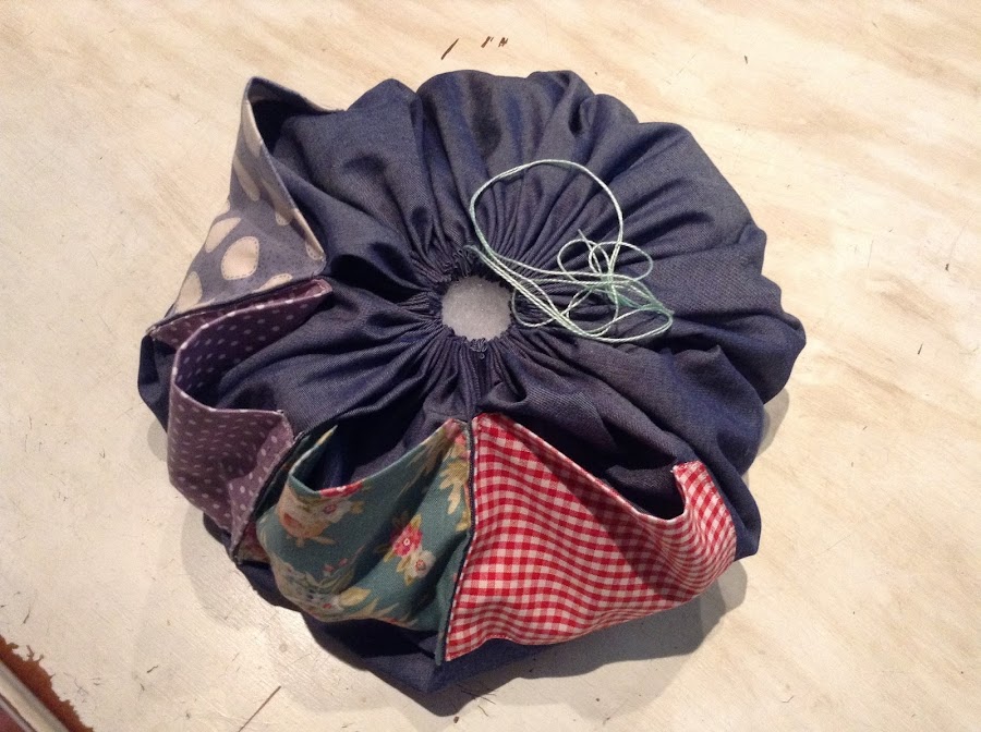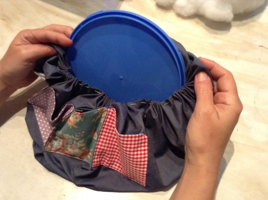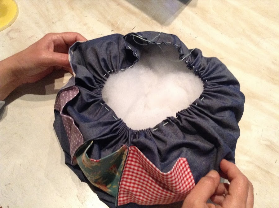 Una vez hayas llegado al punto de partida, antes de fruncir del todo, colocas dentro de la bolsa resultante la tapa y un poco de relleno en los bajos y encima de la tapa. NO DEBES RELLENAR TODA LA BOLSA!!!