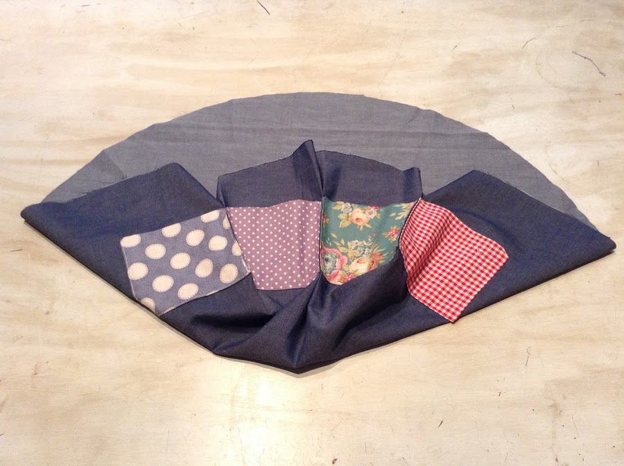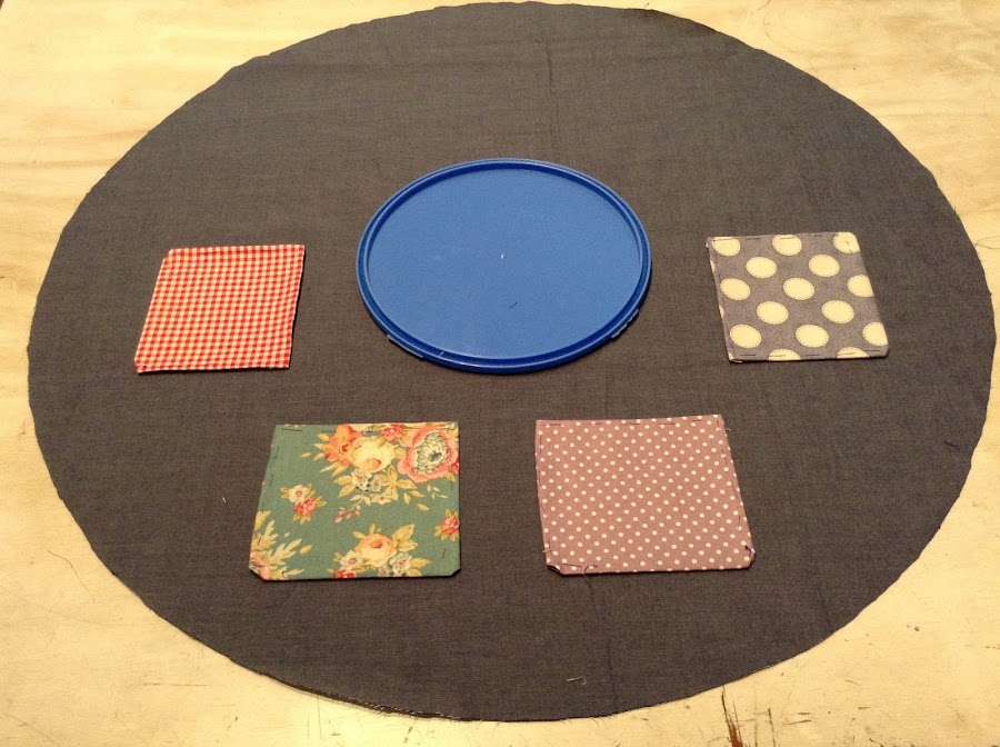 Ahora fíjate bien es este paso...es importante. Coge el circulo de tela y le colocas la tapa en el centro. Después coloca encima los 4 bolsillos, dejando unos 4cms. de separación entre ellos y todos a unos 4 cms. de distancia de la tapa, así (foto)