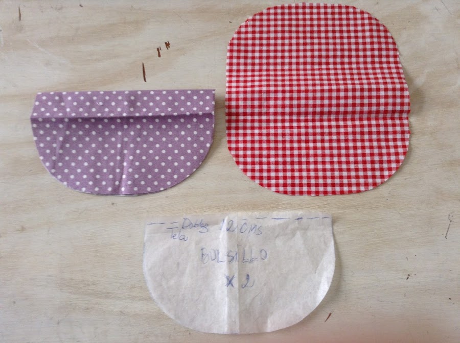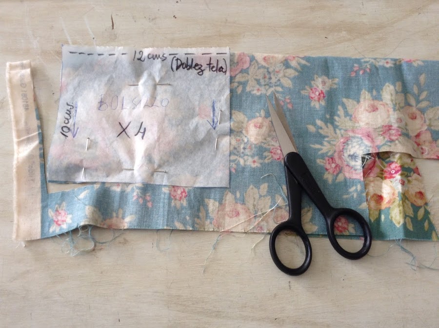 Haz un patrón de 12 cms. x 10cms. Será el patrón de los bolsillos y tienes que cortar 4 bolsillos.