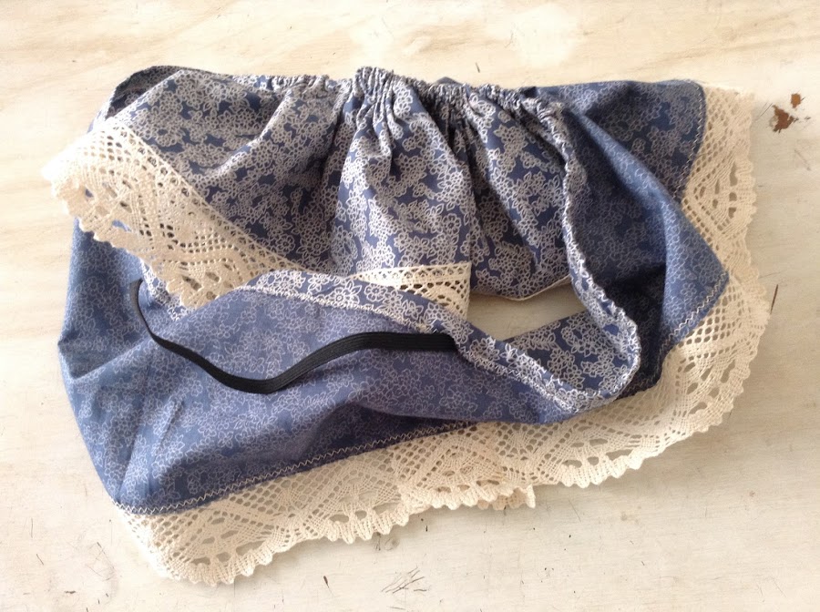 Una vez tengas los dos pulidos con el zigzag, le embastas unas puntillas por encima del zigzag, los colocas dónde quieres que vayan y los fijas a la tira de tela con un repunte.