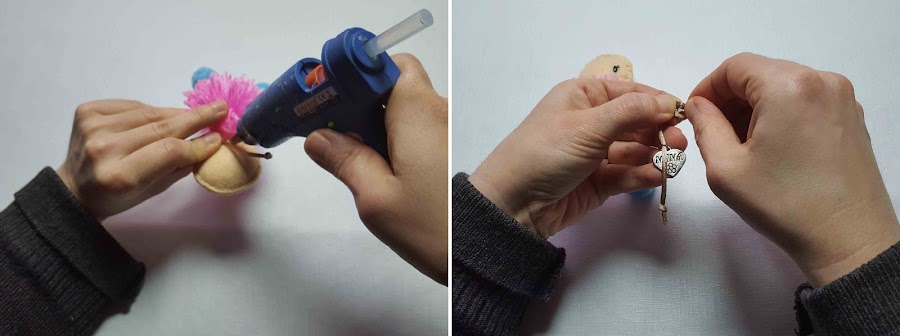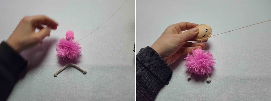 Se pega el trozo de cuerda que serán los brazos, se le puede poner un colgante antes de pegar los brazos.