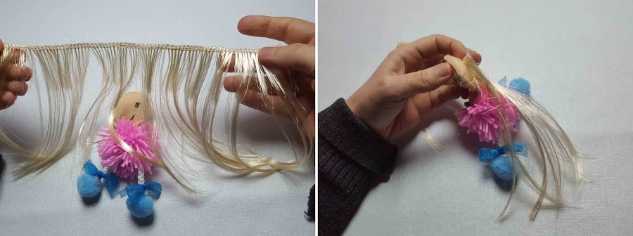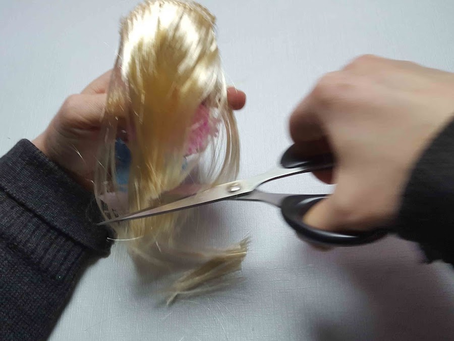 Se le pega el pelo sintético ( o lana ) y se corta para igualar el pelo.