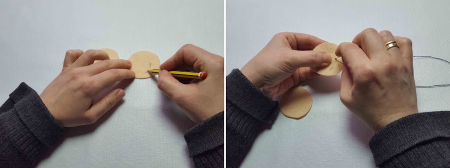 Se recorta la plantilla de la cabeza y se pone encima del fieltro. Se repasa con un lápiz dos veces y se recortan las dos partes.