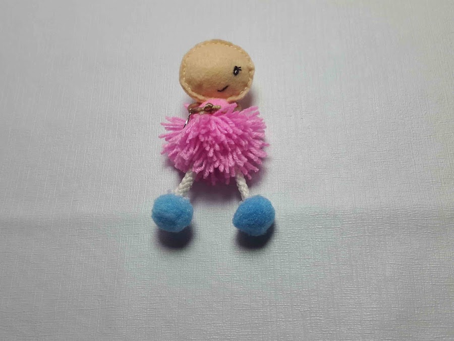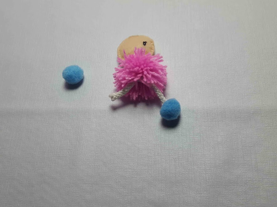 Se unen las piezas, las piernas, el pompón de lana, el pompón mas pequeñito y la cabeza con aguja e hilo. Se pegan los pompones que serán los zapatitos.