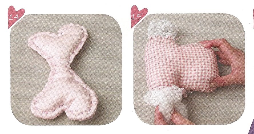 15.- Cosemos el calzón, le aplicamos una puntilla, rellenamos y hacemos una bastilla para ajustar.
