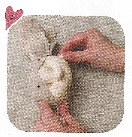 7.-Sujetamos con alfileres a la cabeza y cosemos con punto festón.