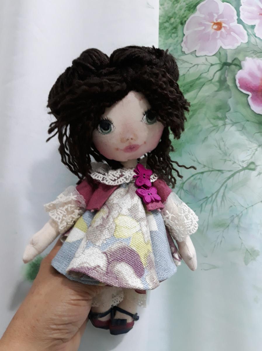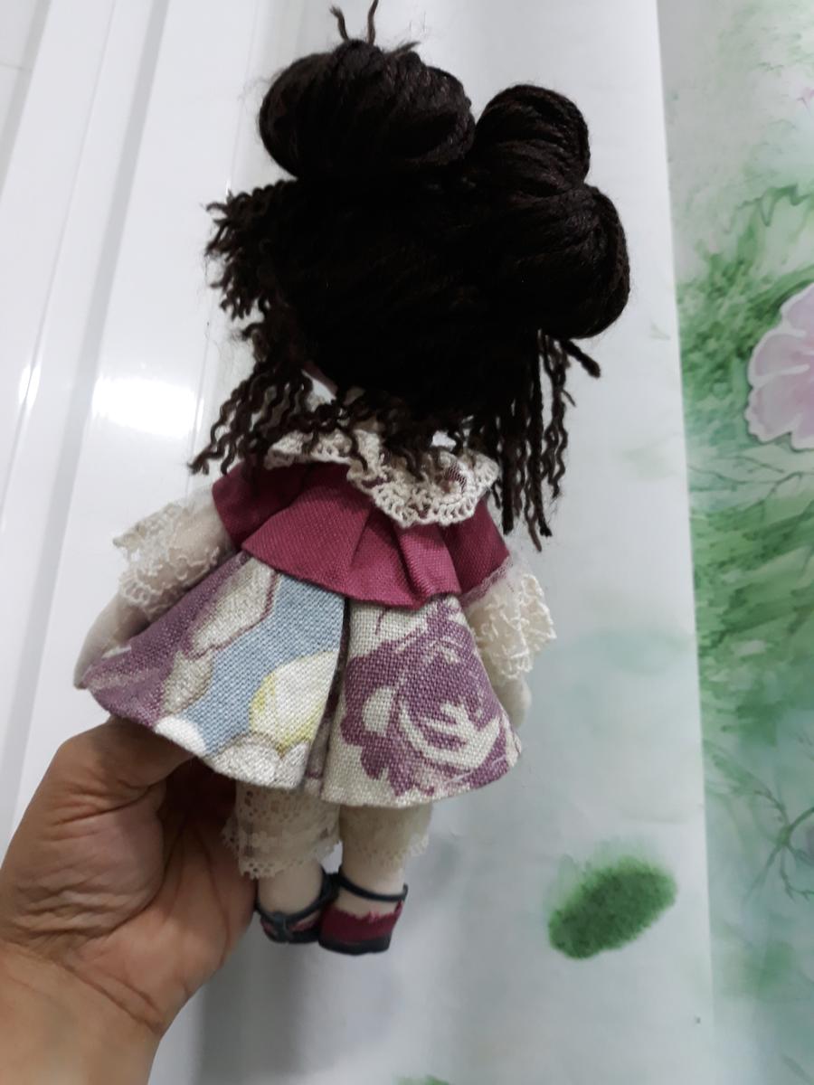 Muñeca de tela, o trapo, hecha completamente a mano, el pelo de lana, recogido en dos monos, la carita pintada a mano, vestido con cuello y mangas de puntilla de tul bordado, los pololos son de puntilla adornados con un mini lazo y unas rosas lenceras de raso, los zapatitos son de piel y tela, como la chaquetita.