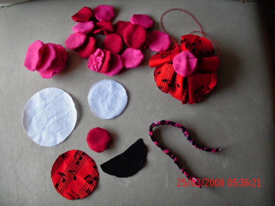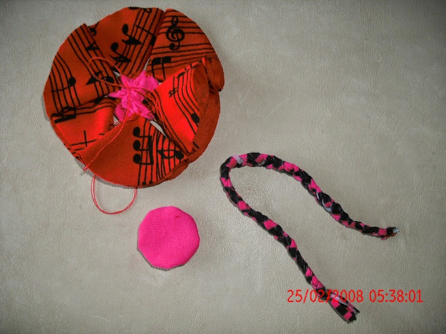 AQUÍ YA TENGO LOS YOYO FRUNCIDOS, Y ESA TRENZA ES PARA LAS PIERNAS, ADEMAS TENEMOS QUE CORTAR UN CIRCULO MAS DEL TAMAÑO DE LOS BRAZOS PARA COLOCARLO ENTRE LA CABEZA Y EL CUERPO A MODO DE CUELLO, YO LO CORTE DEL MISMO COLOR DE LA POLLERA. EN TOTAL CORTE UN CIRCULO PARA LA CABEZA, 1 PARA EL CUELLO, 2 PARA LAS MANOS, 8 PARA CADA BRAZO (EN TOTAL 16 CÍRCULOS) , 6 PARA LA POLLERA Y 2 MEDIOS CÍRCULOS PARA LOS ZAPATOS, LAS PIERNAS LAS HICE CON TIRAS DE TELA, LAS CORTE FINAS Y LAS TRENCE, Y ME OLVIDABA HAY QUE CORTAR 2 CÍRCULOS MAS DEL TAMAÑO DE LOS BRAZOS PARA SOSTENER LA POLLERA.