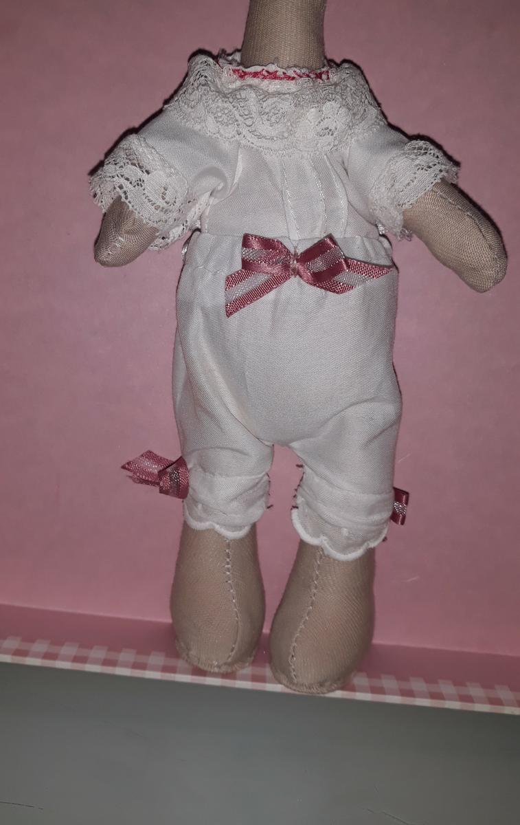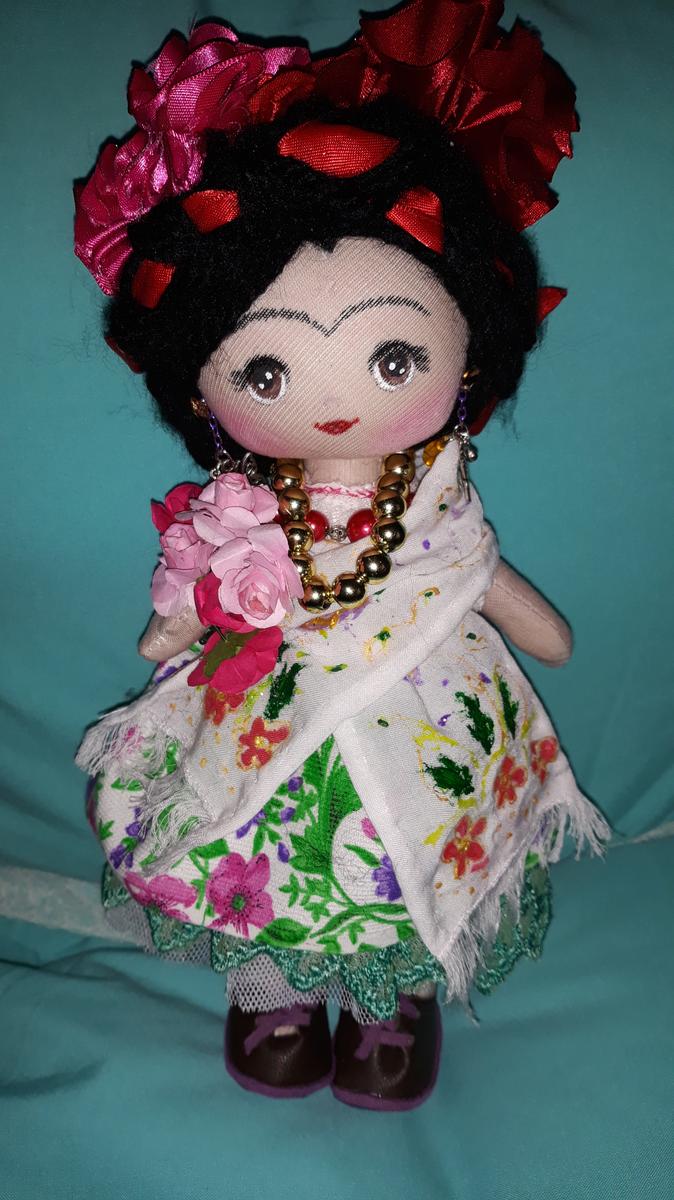 La camisa y los pololos son de batista fina con remates de puntilla y punto de cruz en el escote de la camisa.La camisa está pintada a mano igual que el fular, los flecos están sacados de la misma tela y rematados a vainica.La falda es de piqué de algodón y la combinación es de tul bordado y lleva otra de tul solo.