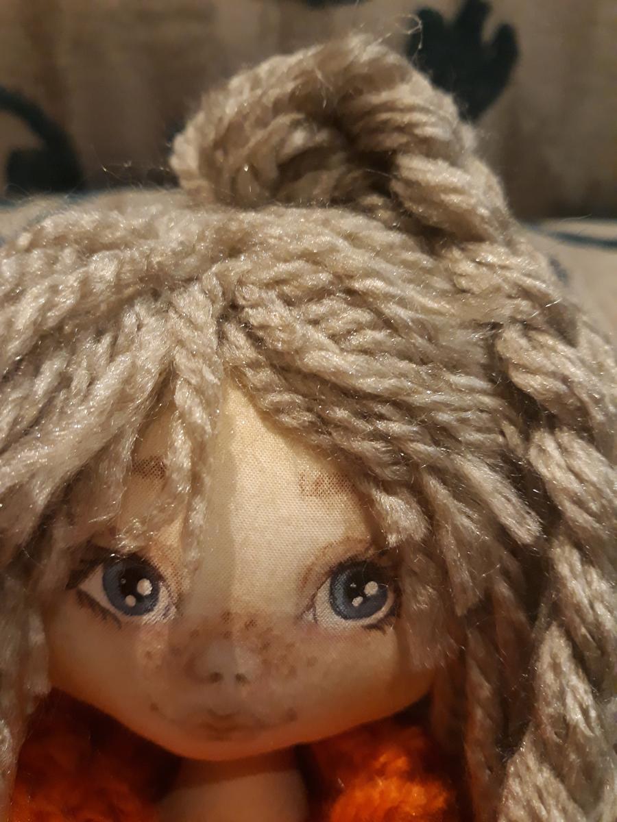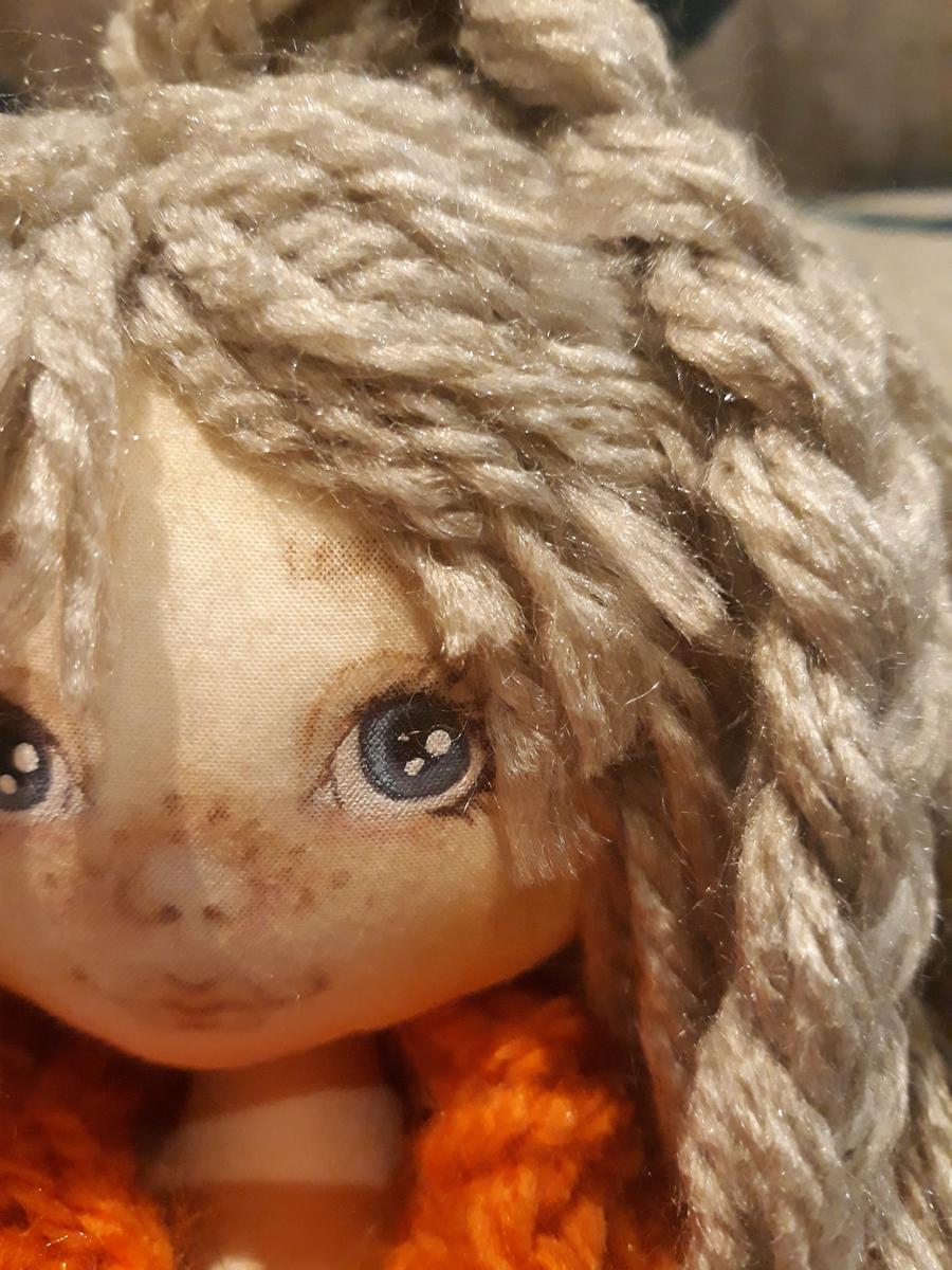 La carita está pintada a mano alzada, o sea, sin patrón, por eso es única, no hebrá otra muñequita, con su misma carita y expresión, el pepito de lana, lo tiene recogido en una cola de caballo y una trenza.