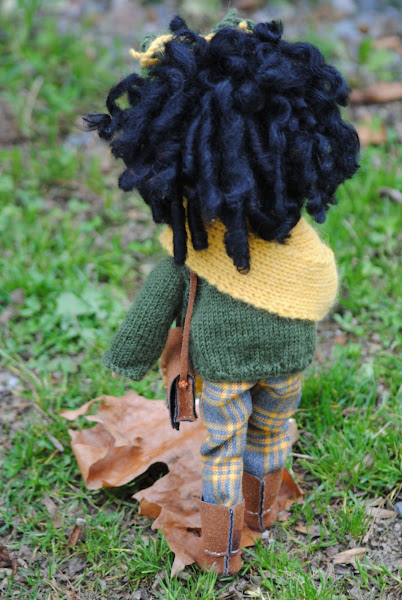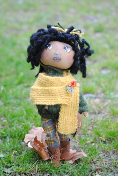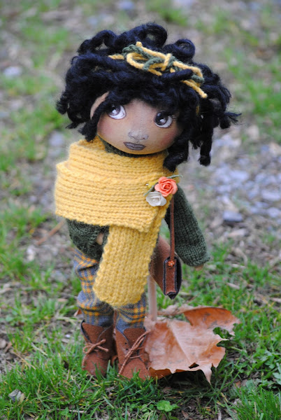 Pensé en hacer un vestido de estilo africano , pero al final decidi que seria una chica moderna desenfadada, a si que ahí va con sus pantalones a cuadros , jersey verde y maxi bufanda en amarillo amostazado, las botas y el bolsito son de serraje , hechos a mano.