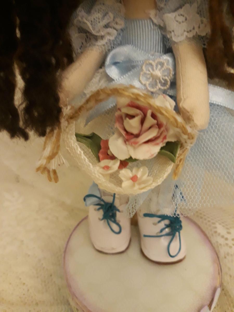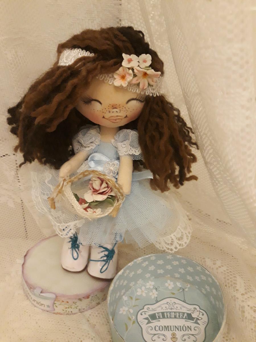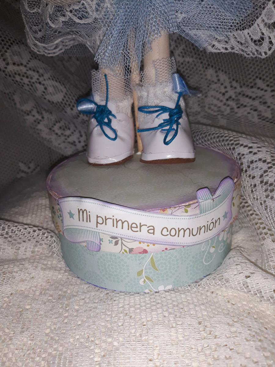 Mide 20cm. Y el soporte está apoyado en una cajita, que se puede rellenar con caramelos o alguna joya de regalo.