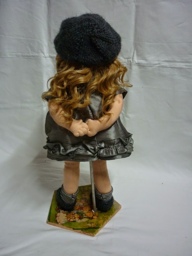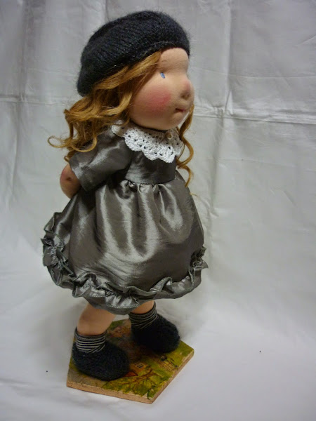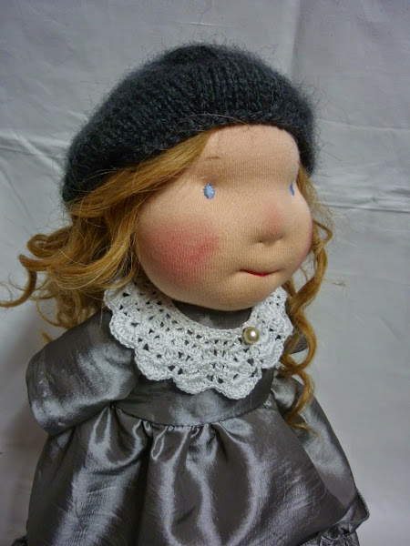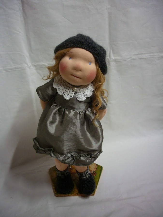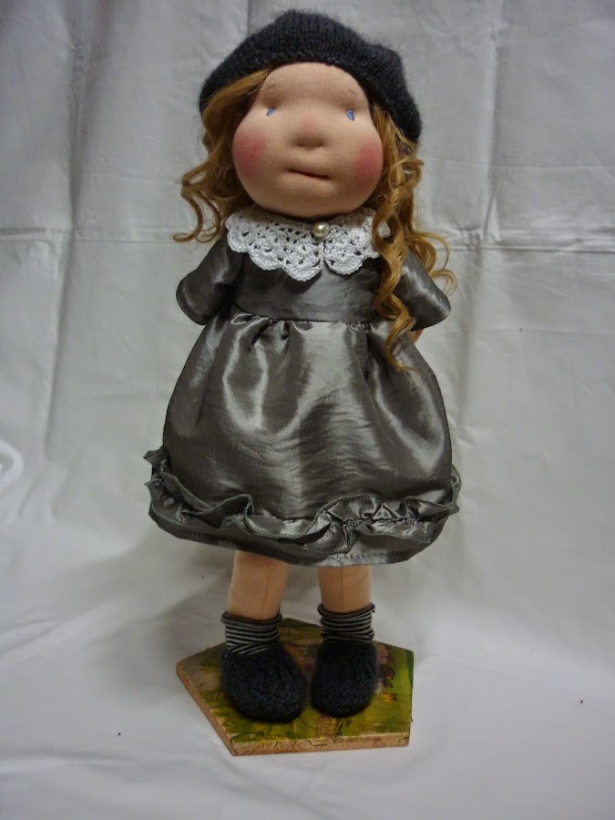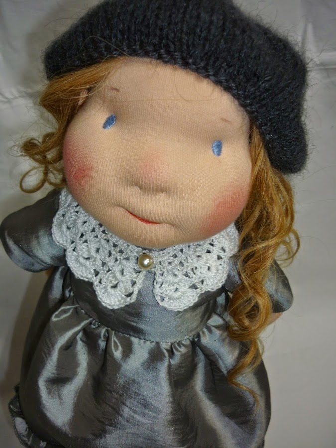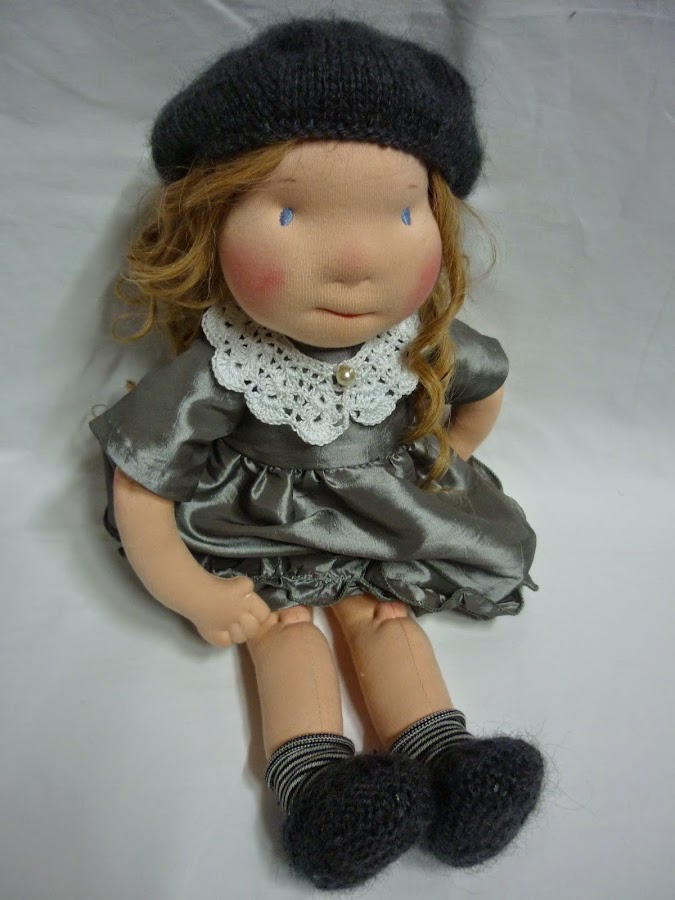 Esta muñeca está confeccionada con materiales naturales , cuerpo de punto de algodón relleno de vellón de lana, el pelo a diferencia de otras que lo llevan de lana de moahaire esta es de pelo natural también de mohaire.