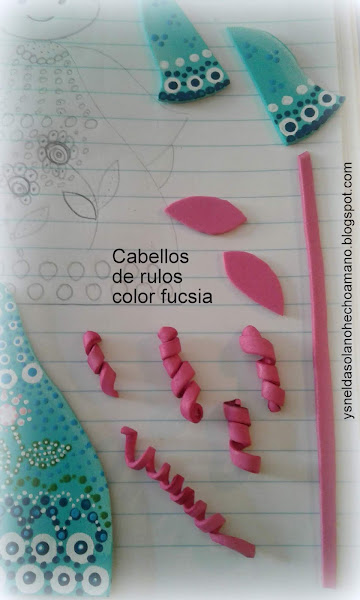 5.- Para el cabello realicé tiras de foami color fucsia y enrollé en forma de rulos.