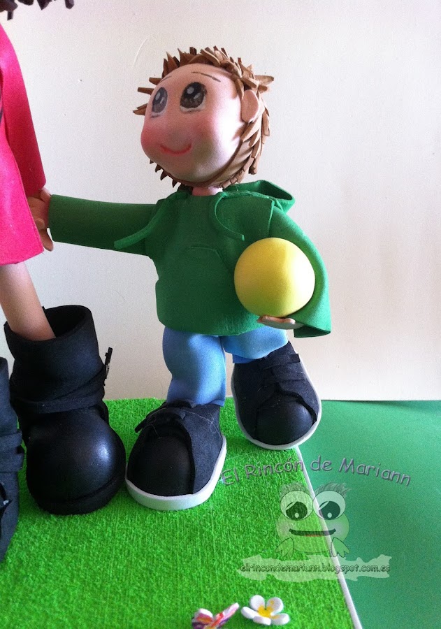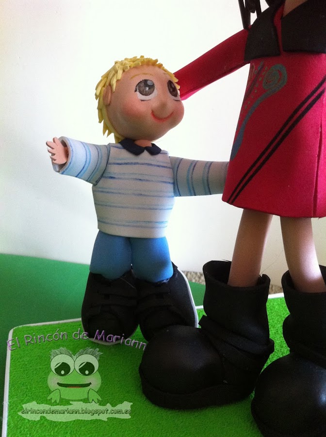 Es una muñeca con el vestido personalizado y pintado a mano, las botas también personalizadas. Lleva a sus peques al parque, el más chiquitín ya está cansado y quiere ir en brazos mientras el otro peque, se queda más rezagado.